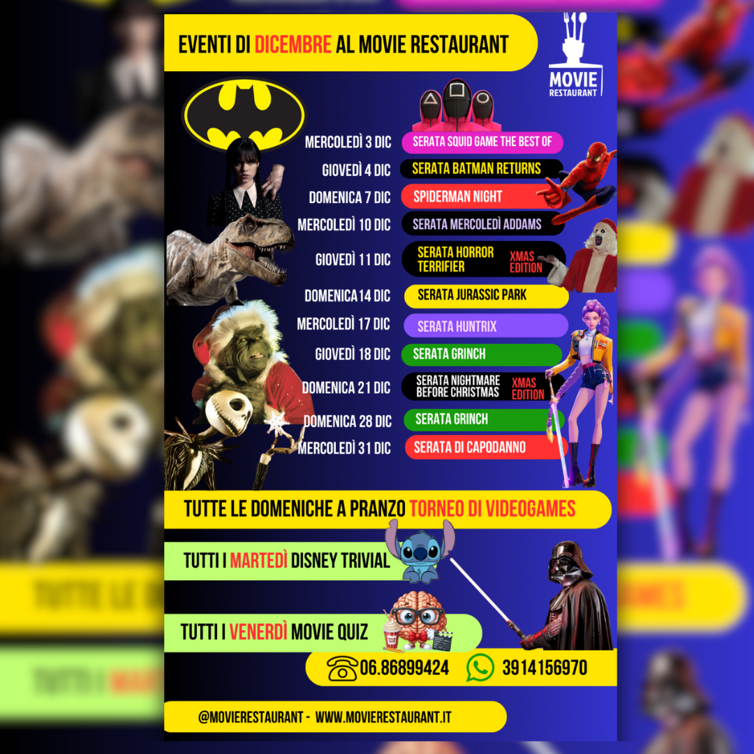 ๐ฌ EVENTI DICEMBRE 2025 ๐ฎ Eventi fissi Tornei Videogiochi โ Dom pranzo ๐ Disney Trivial โ Mart 2/9/16/23/30, h 20:30 ๐ฅ Movie Quiz โ Ven 5/12/19/26, h 20:30 ๐๏ธ Eventi speciali ๐ฆ Squid Game โ Mer 3, h 20:00 ๐ฆ Batman Returns โ Gio 4, h 20:30 ๐ธ๏ธ Spiderman โ Dom 7, h 20:30 ๐ค […]