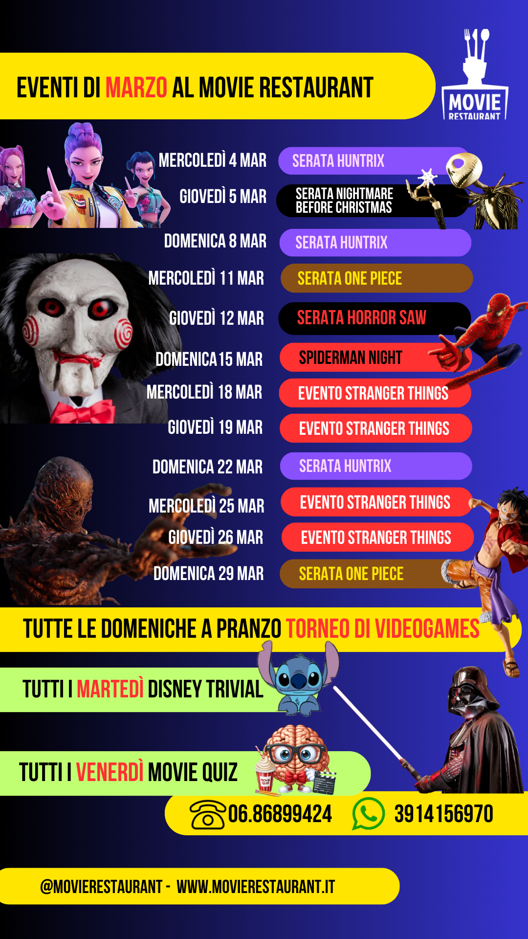 Carissimi amici del Movie Restaurant, ecco a voi il CALENDARIO DEGLI EVENTI previsti per il mese di MARZO 2026